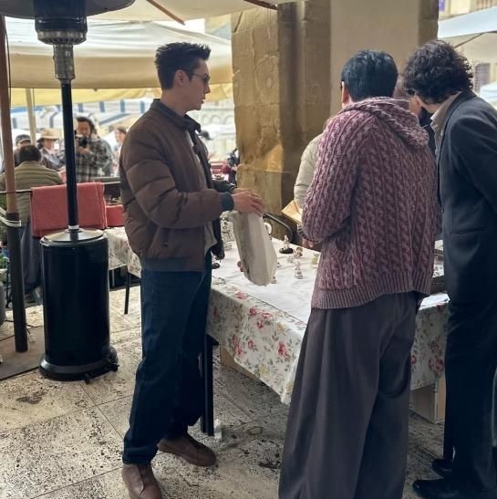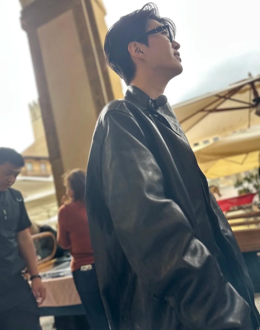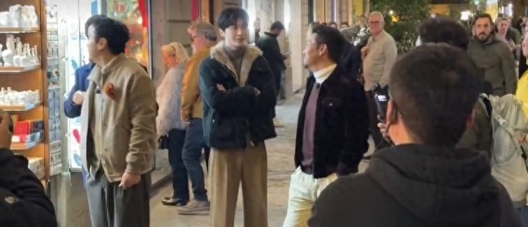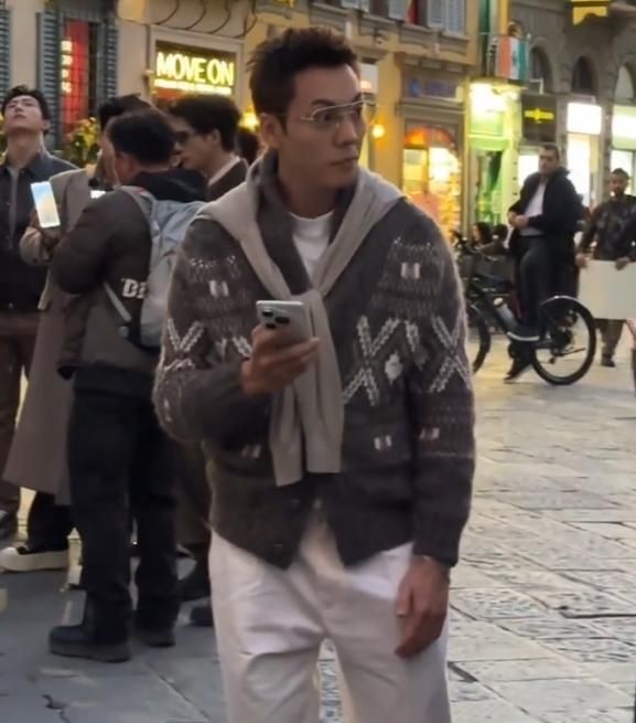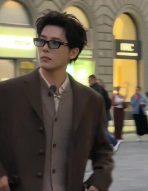 身穿浅棕色夹克配蓝裤子,单手插兜头戴墨镜,头发梳得整齐,没留以前的碎发,走在石板路上,被外国游客误认成奢侈品牌代言人。