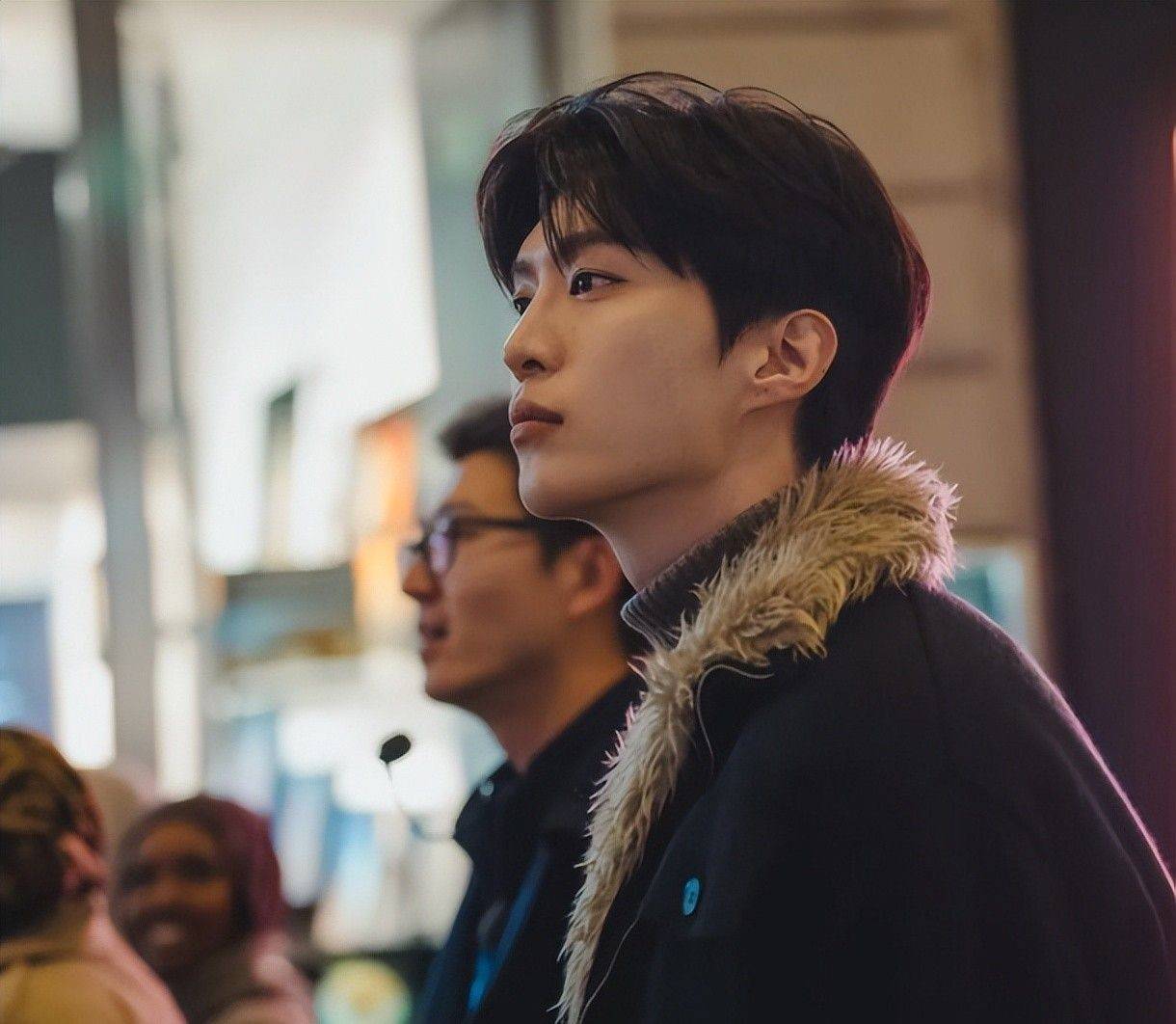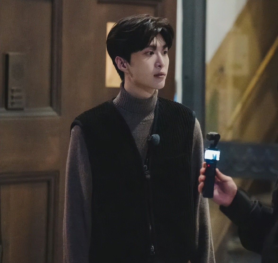 他穿高领毛衣,还有黑色的马甲,明明同样是毛衣,但是他穿着却有质感,下颌线利落,颜值纯帅。
